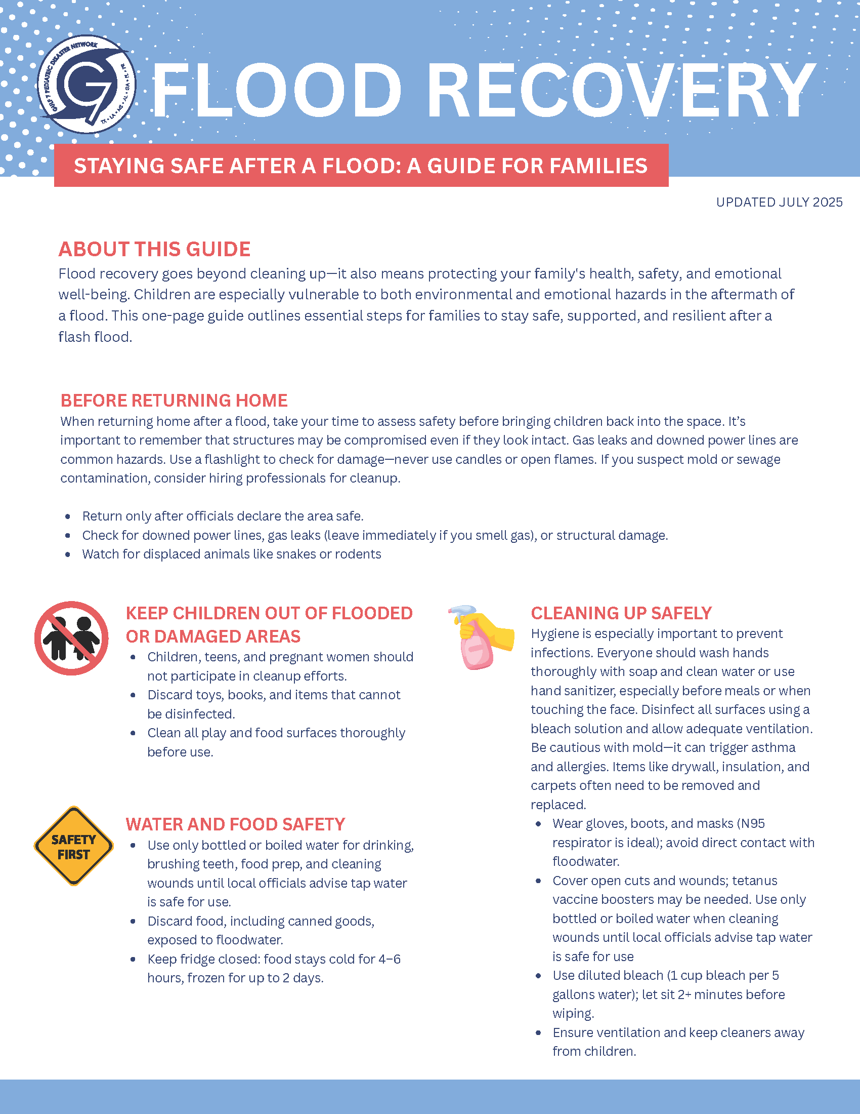 This one-page guide outlines essential steps for families to stay safe, supported, and resilient after a flash flood.